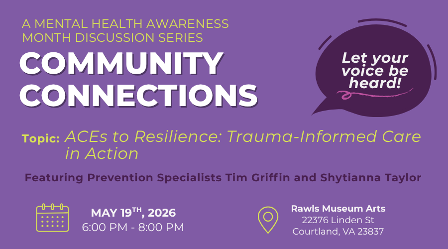 May is Mental Health Awareness month and we invite you to join us for Community Connections, a discussion about ACEs to Resilience: Trauma-Informed Care in Action in Southampton County. Connect with members of your community, share your thoughts, and help us grow stronger together.